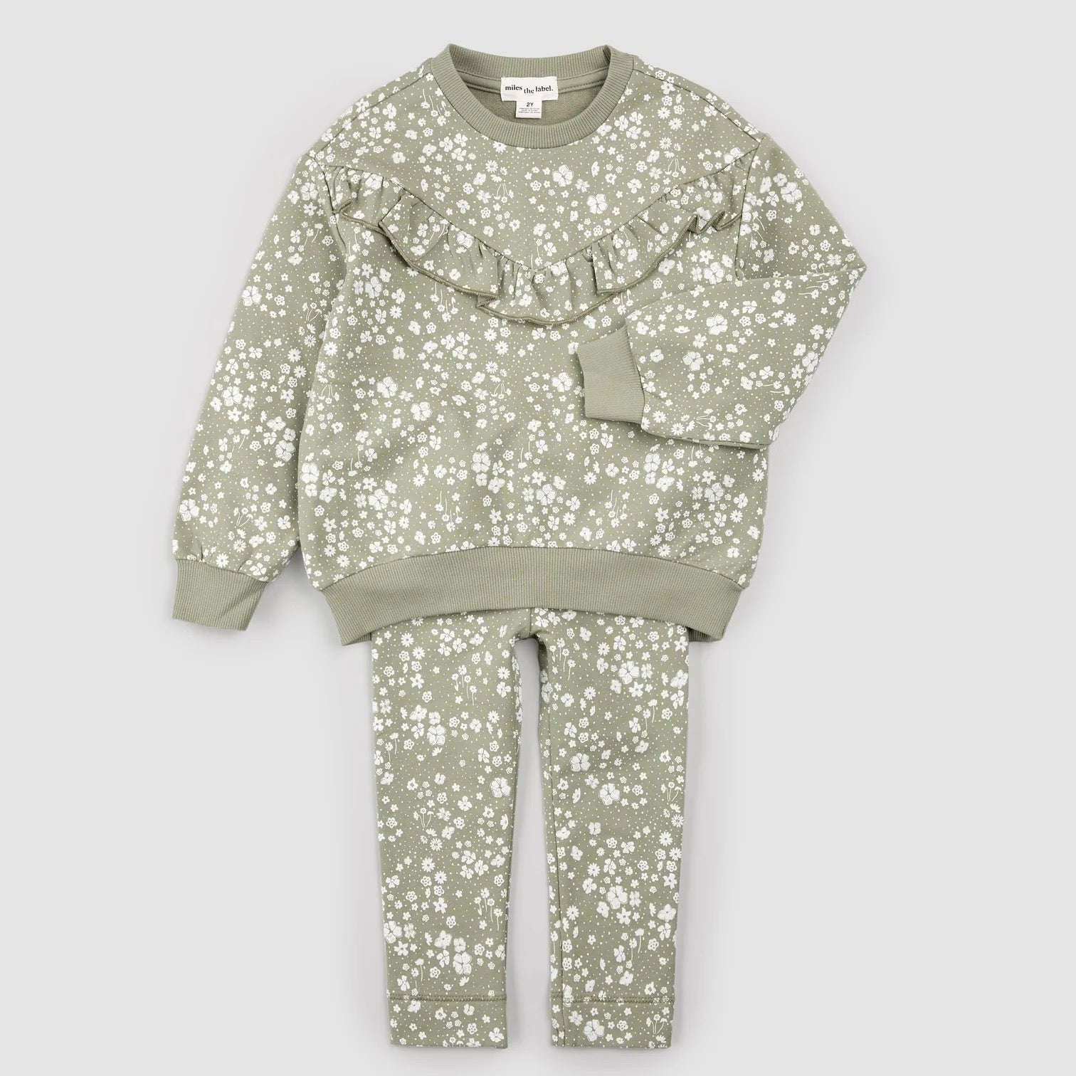 A charming floral set to add a little prettiness into every day. This soft and stretchy set includes sage tones, ruffle details and a ditsy floral print to brighten grey Fall days. With a rounded neckline, and an elasticated waistband on the leggings, she’s all set for comfortable all-day fit. Sweet, stylish, and perfect for playtime.