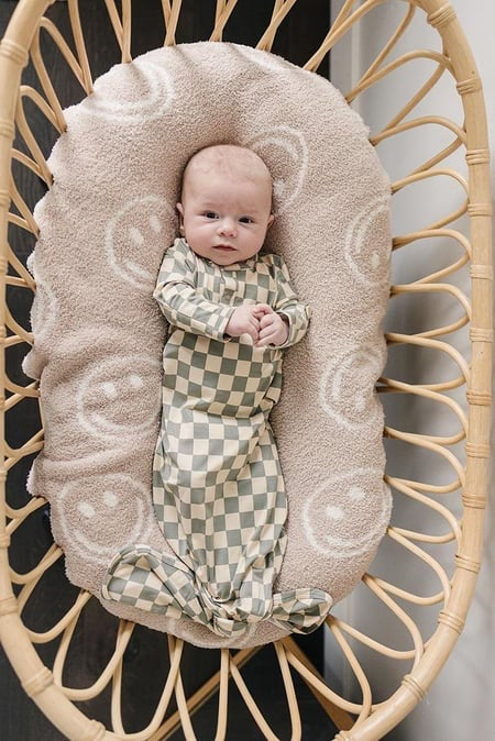These gowns are size 0-3. They are made out of supremely soft Bamboo Rayon to keep your little one comfortable. We have a variety of gender neutral designs and colors making them perfect for any baby. They have fold over hands and two snaps for easy on and off. We also have shoulder flaps to make it easily pull over your little ones head, we want to make dressing your baby as easy as possible. The bottom is easily tied and untied in a knot for no-fuss diaper changes which makes it a newborn baby essential!